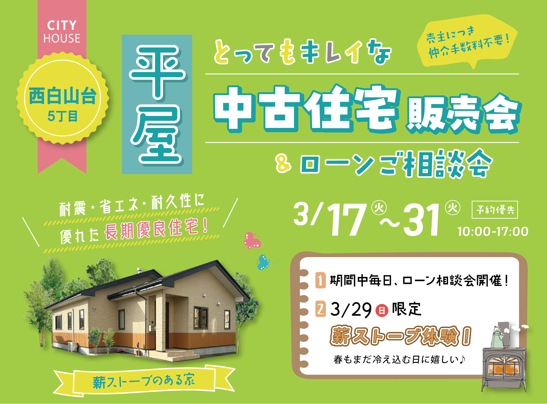 \築7年の薪ストーブ付きの平屋販売会!/ 耐震・省エネ・耐久性に優れた長期優良住宅 だから、安心して長く住み続けられます♪ 期間中毎日、ローン相談会開催! 3/29(