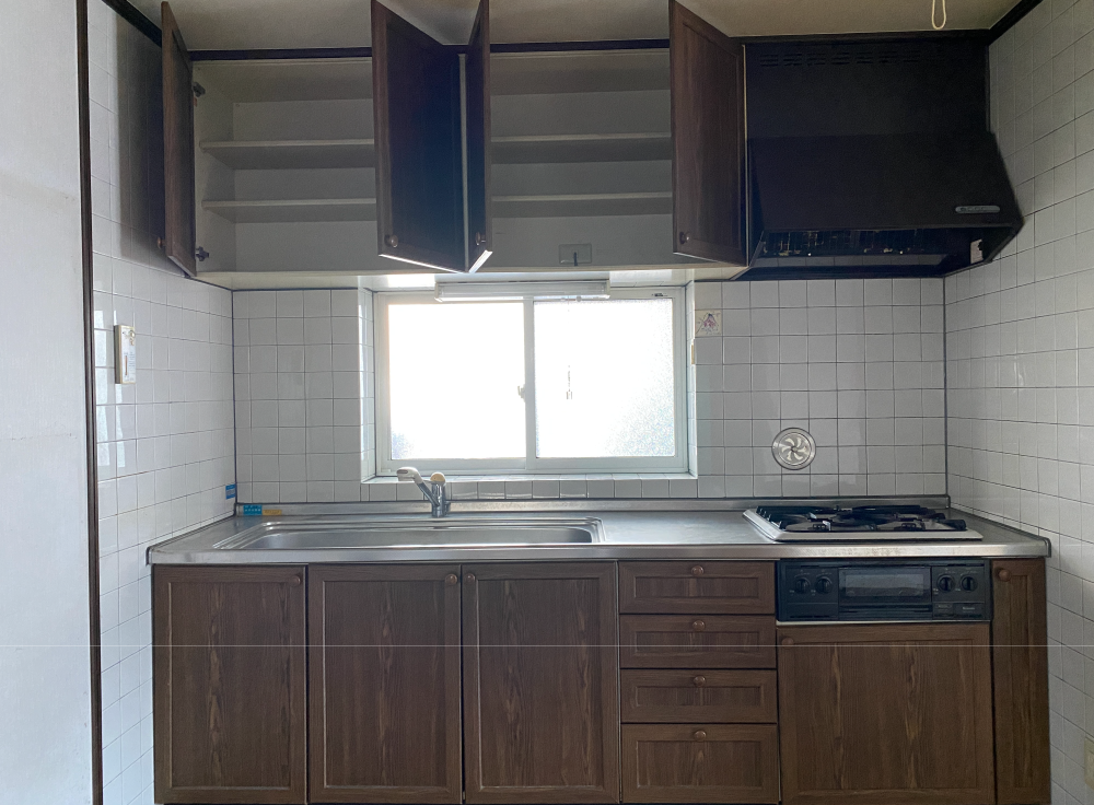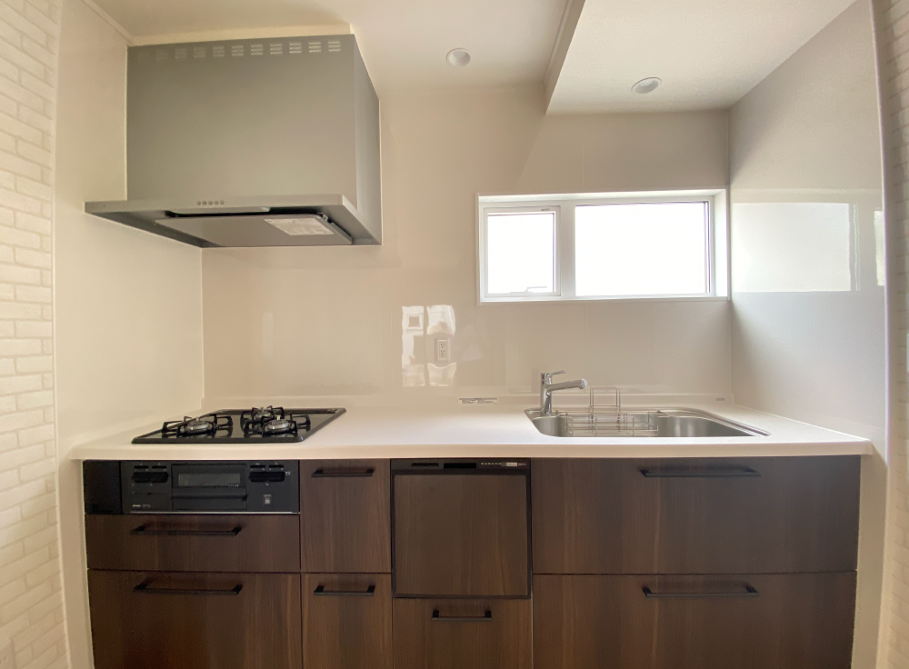 食器洗浄乾燥機付のキッチンにリフォーム。キッチン壁はお手入れがしやすいパネルに変更。吊り戸棚をなくし、窓の位置を高くすることで明るいキッチンになりました。