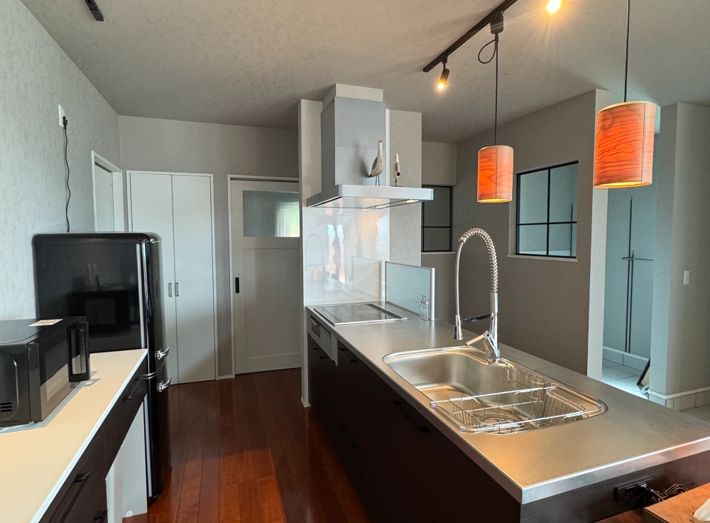 開放的なアイランドキッチンへ間取り変更。 広いスペースなので、家族と一緒に料理ができるのも嬉しい造り。
