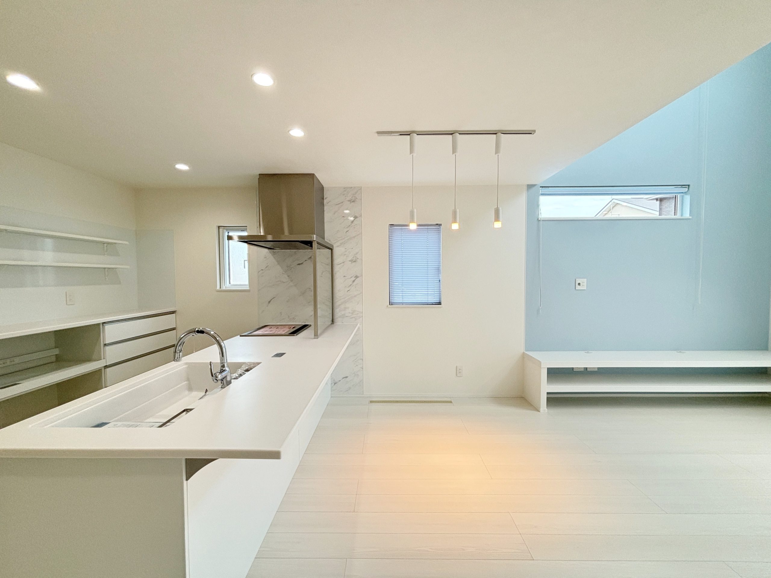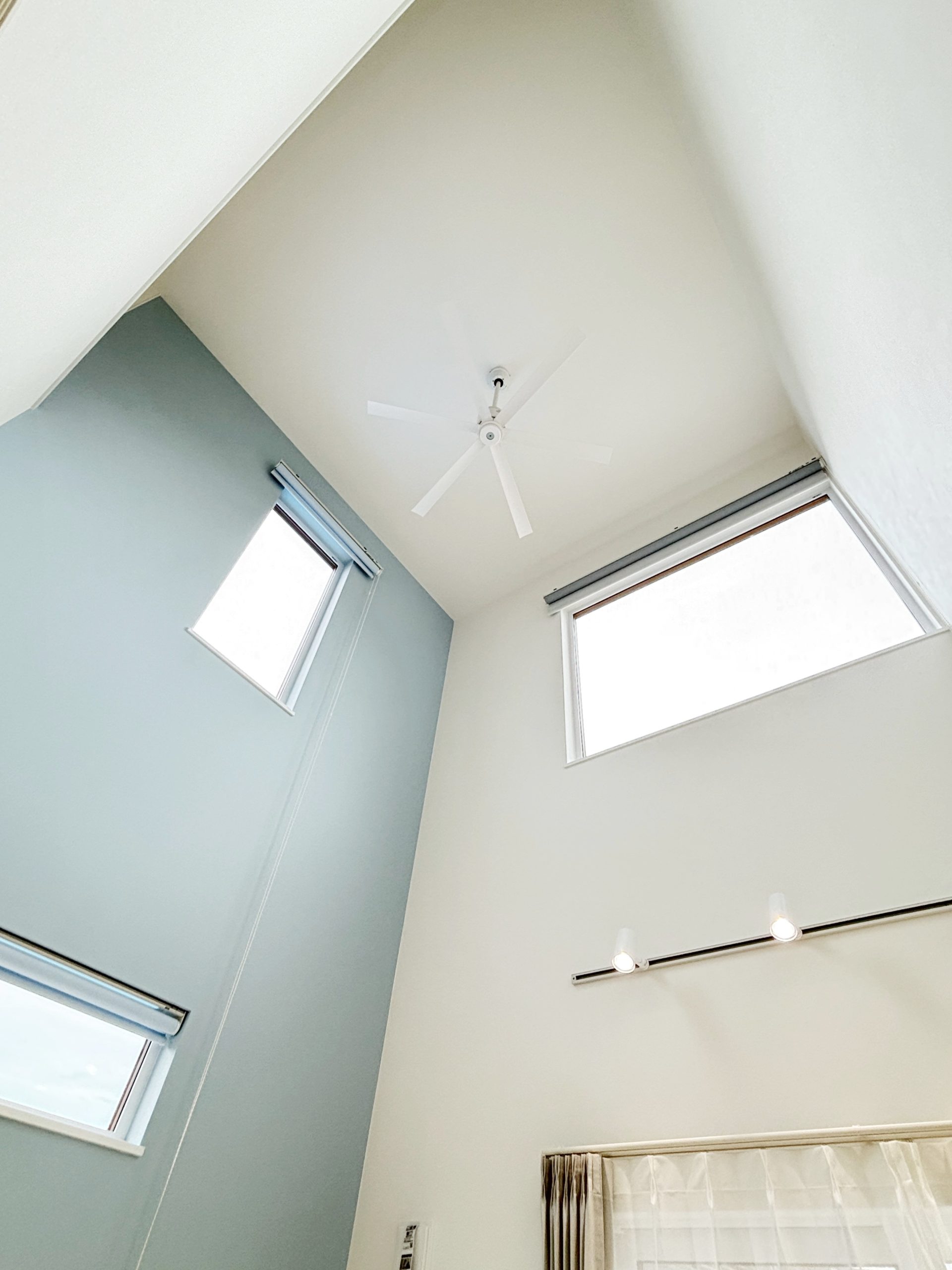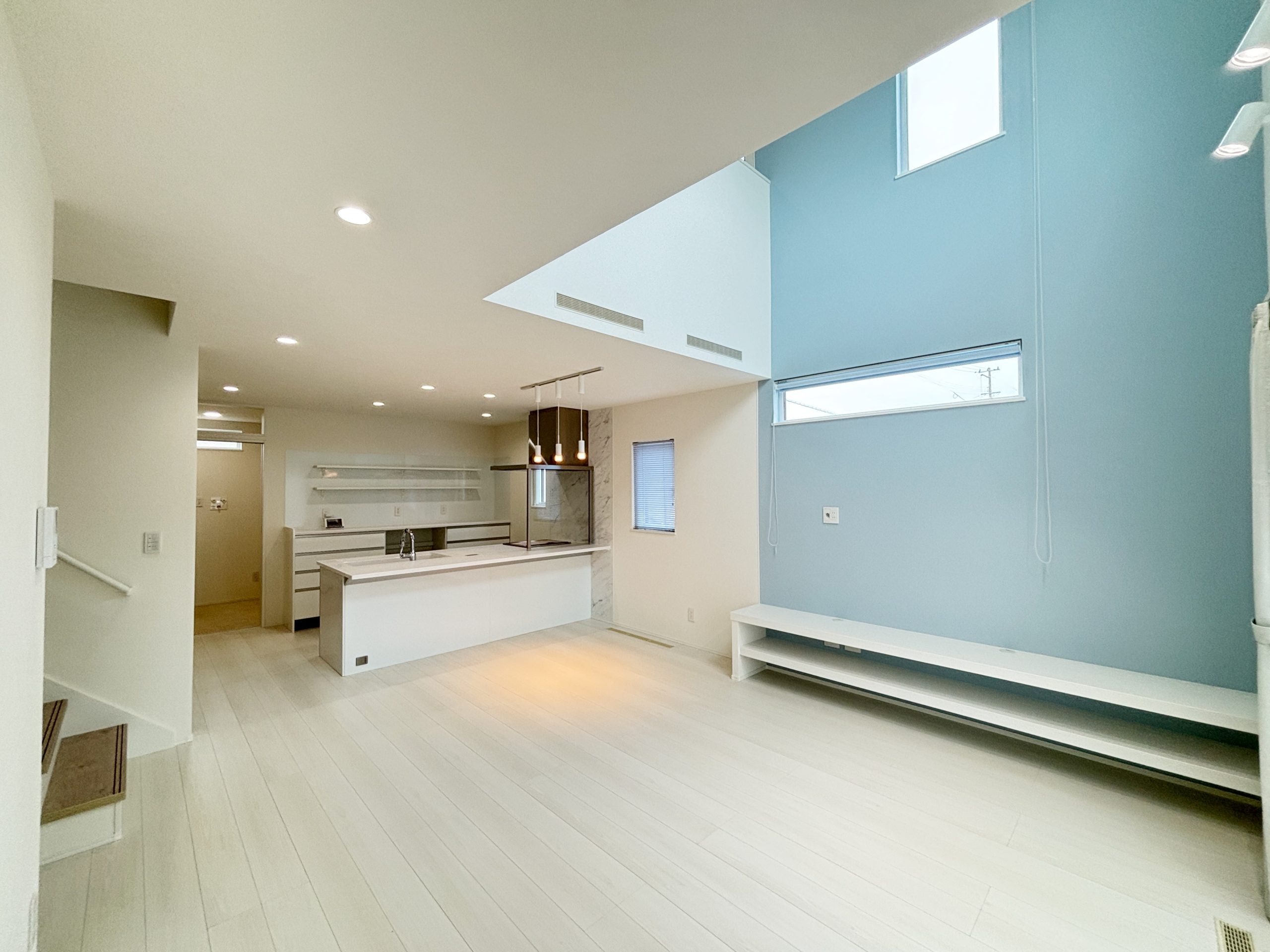 白を基調にした開放的な吹き抜けリビングの住まい。